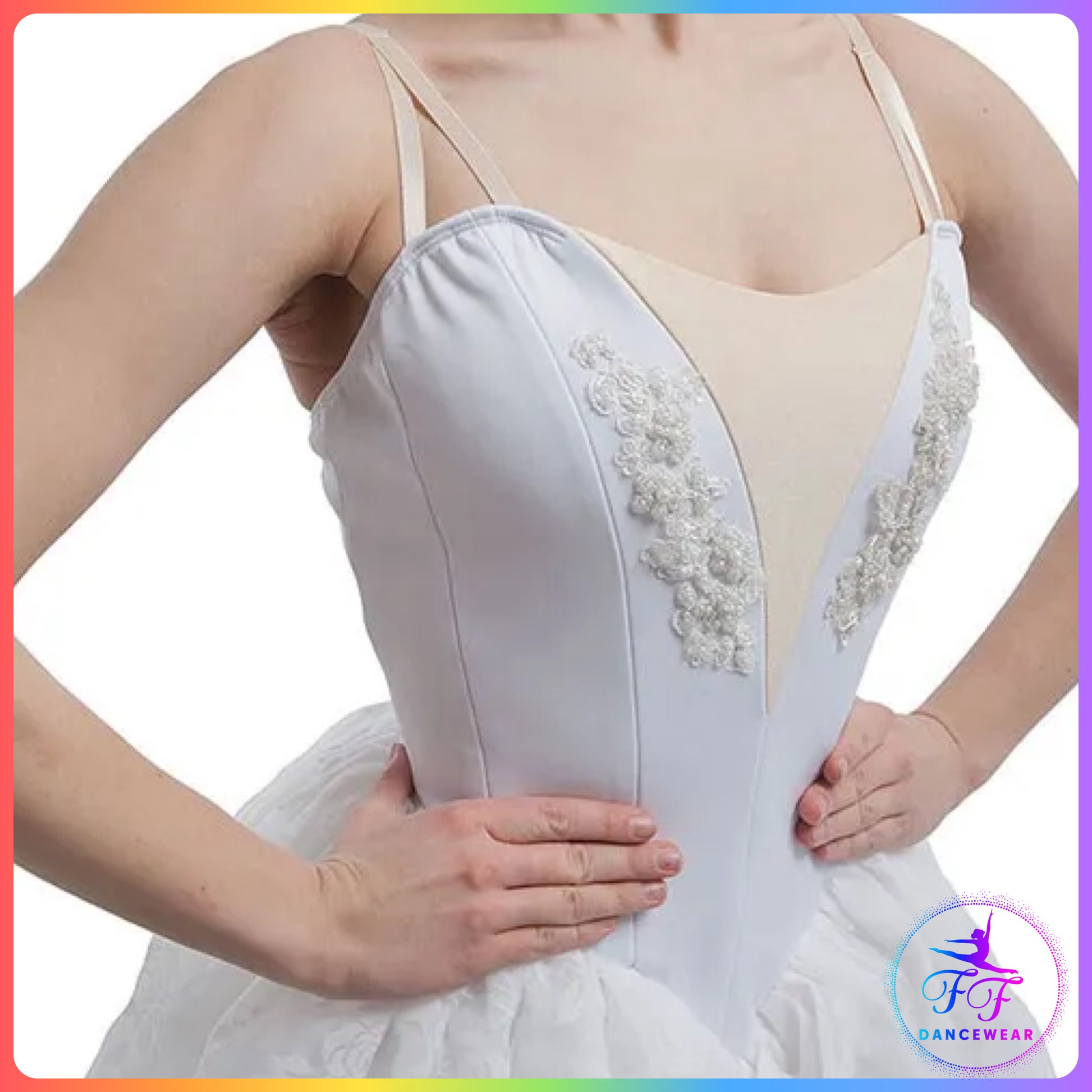 White spandex bodice with deep 'v' nude panel and floral appliques, attached layers of soft tulle romantic tutu skirt.