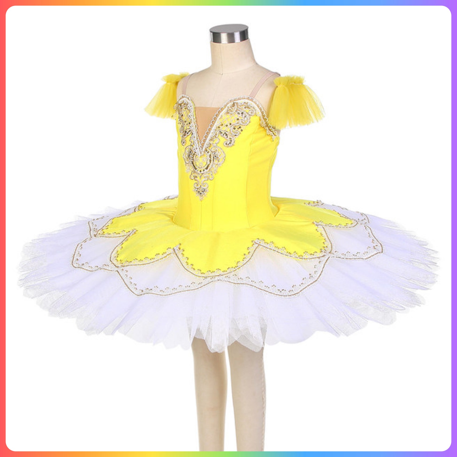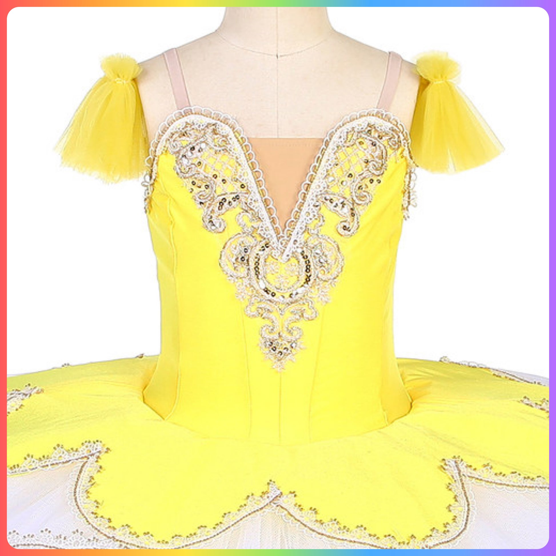 Yellow Stretch Spandex bodice with gold trim and nude 'V' neckline, graduated layers of pleated ballet net to create a stunning pancake tutu with decorated top plate.